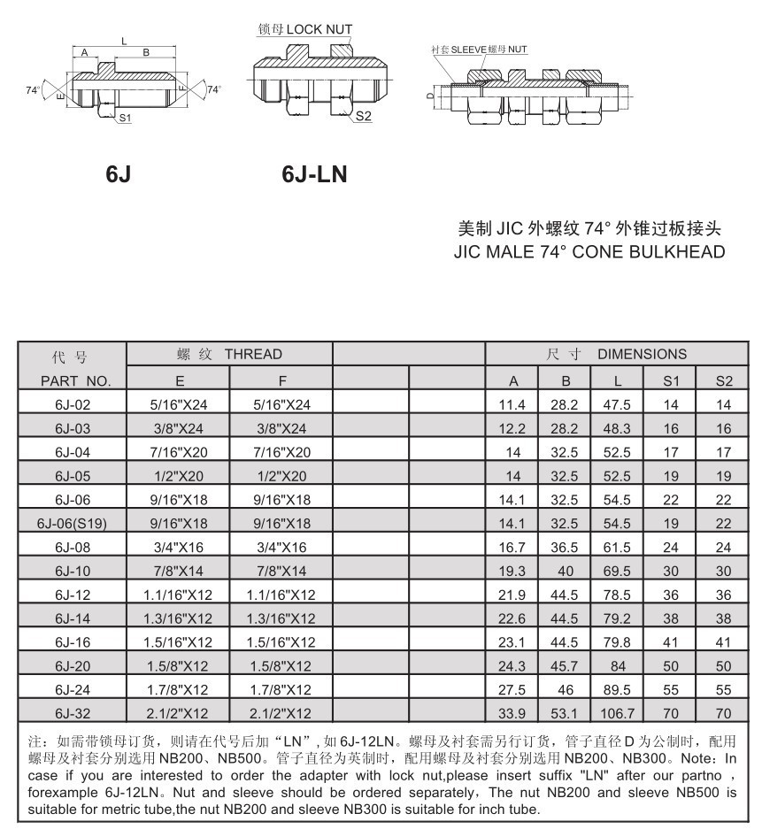 液壓接頭6J直通雙邊美制 JIC 外螺紋 74° 外錐過板接頭過渡接頭
